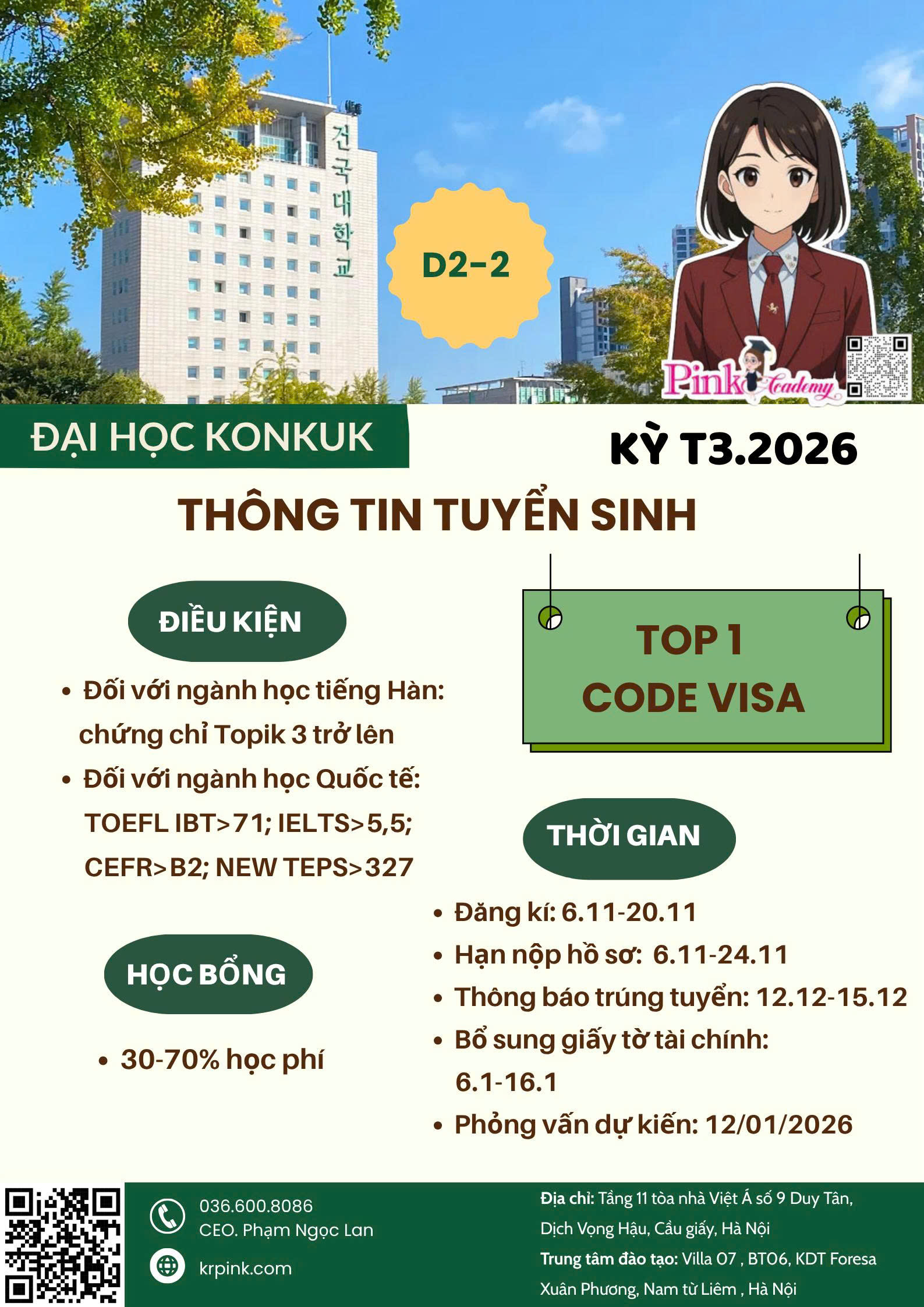 Bạn đang tìm kiếm cơ hội du học tại một trong những ngôi trường danh tiếng hàng đầu Hàn Quốc? Đại học Konkuk (건국대학교) – ngôi trường nổi tiếng với chất lượng đào tạo quốc tế và môi trường học tập hiện đại, hiện đang mở tuyển sinh kỳ tháng 3/2026 dành cho sinh viên quốc tế.
